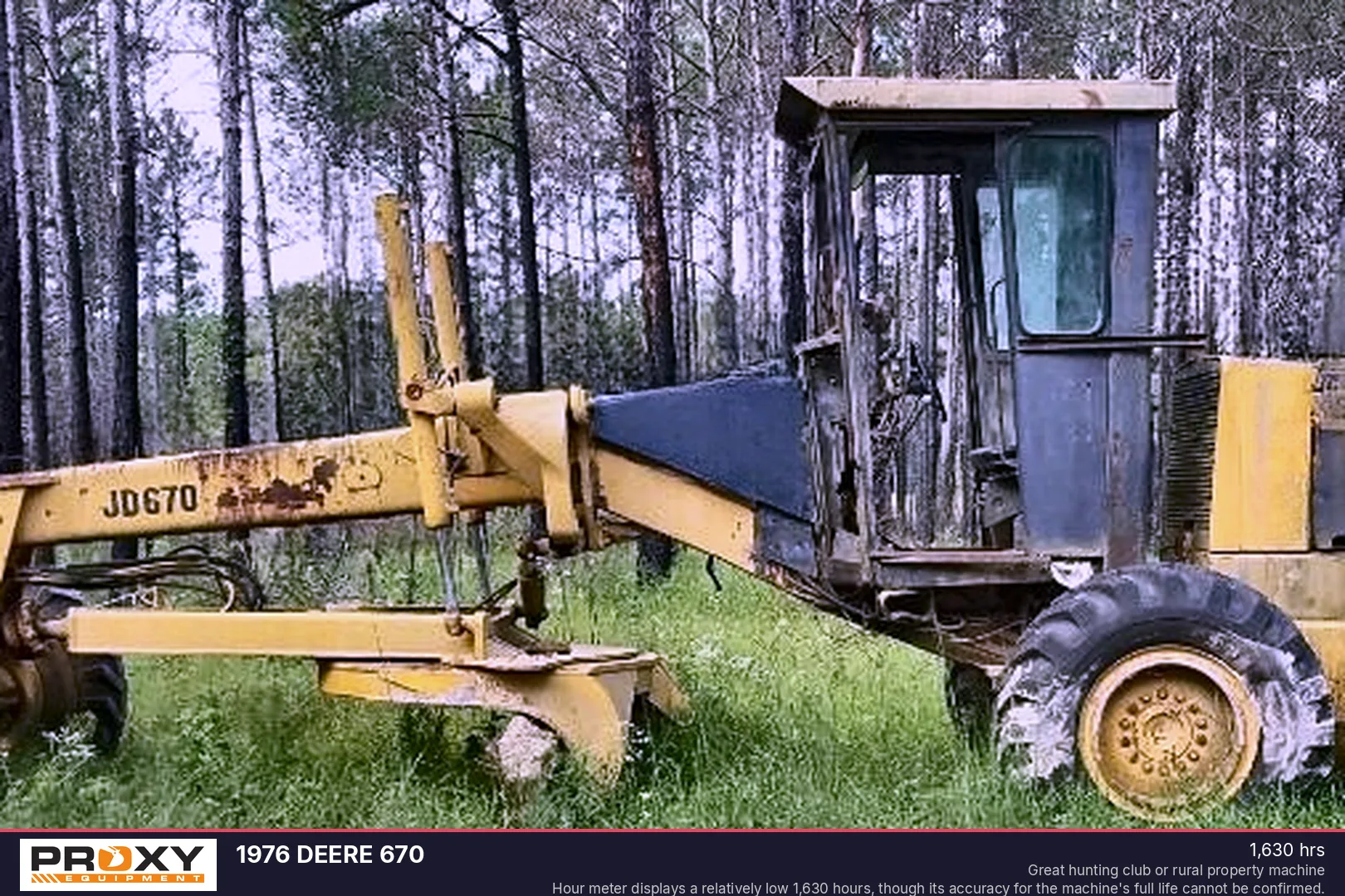 This 1976 Deere 670 motor grader is powered by a 125HP JD 6-414T engine paired with a reliable power shift transmission. Weighing 26,553 lbs and featuring an 8.34ft blade, this unit is in good operating condition and performs as expected. It serves as an ideal solution for maintaining rural properties or managing trails for hunting clubs.