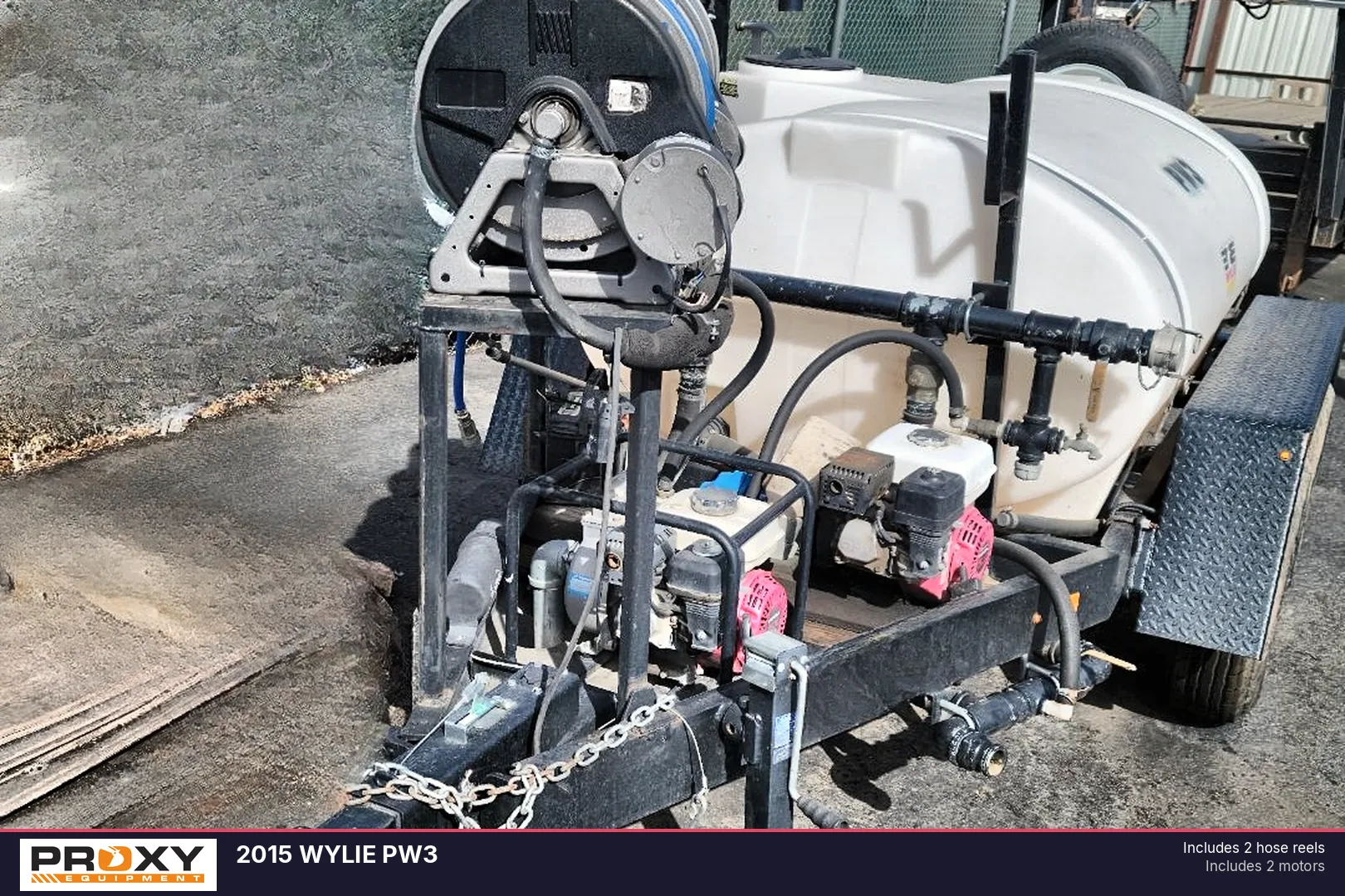 This 2015 Wylie Express PW3 water wagon is a versatile 500-gallon trailer-mounted system designed for dust abatement, fire control, and construction utility. The unit is built on a DOT-approved trailer featuring tandem surge-brake axles and includes a comprehensive dual-pump and dual-motor configuration with two hose reels for efficient operation. With a curb weight of 1,800 lbs and a 6,000 lb GVWR, this user-friendly trailer also comes equipped with an integrated water wagon sprayer and a rear-mounted spare tire.