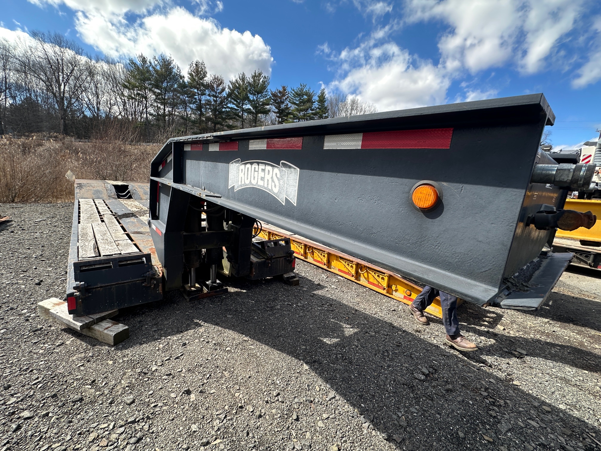 This 1990 Rogers 55-ton tri-axle lowboy trailer offers a robust 126,000 lb. GVWR capacity, making it a reliable solution for heavy-duty hauling requirements. The unit is equipped with a removable gooseneck and features a 295" well and 204" tail section to accommodate oversized equipment.