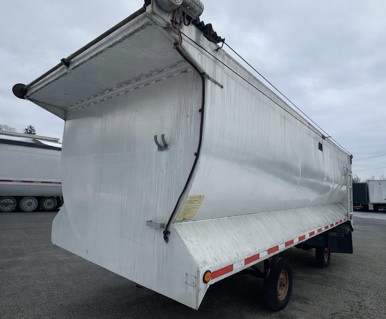 This 2012 Alfab 22-foot aluminum round-bottom dump bed is in great condition and ready for immediate installation. It is well-equipped for hauling operations, featuring a durable 3/8-inch bed liner and an integrated electric cable/slide tarp system. Designed for versatility, the unit includes a convenient scuttle door (coal chute) and maintains a spacious 98-inch width with 74-inch side walls.