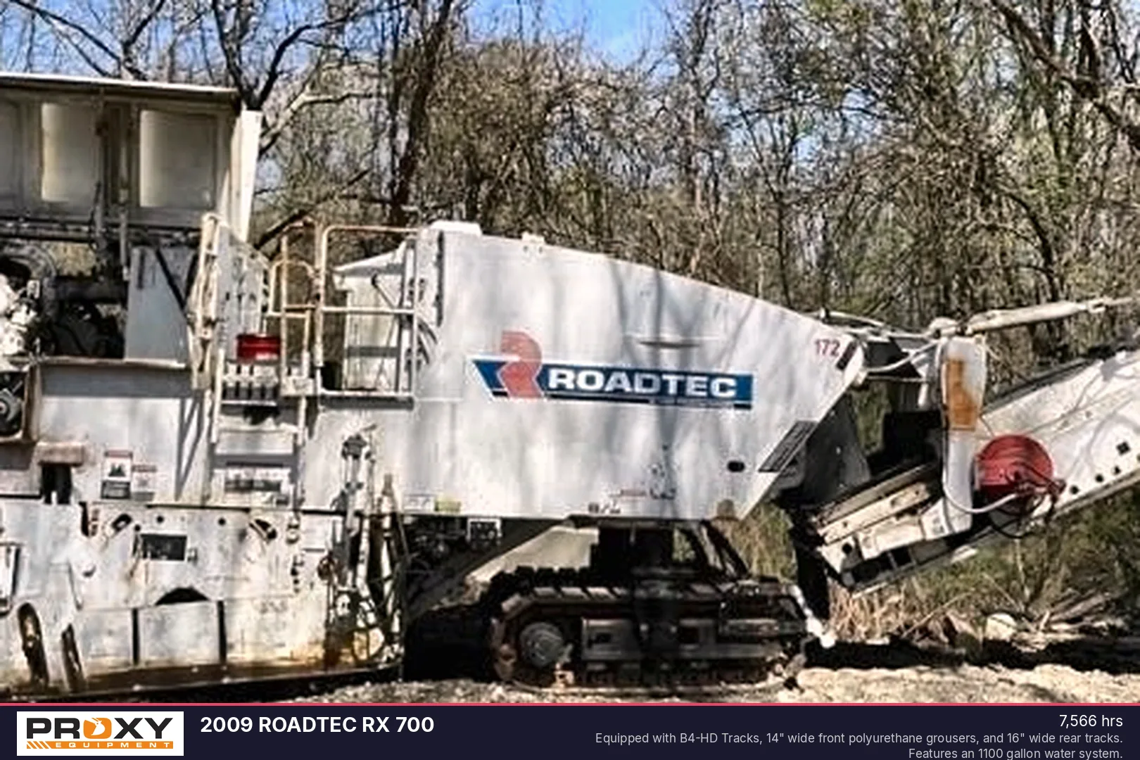 This 2009 Roadtec RX-700 cold planer is a high-production milling machine powered by a 700 HP CAT C18 engine. With 7,566 operating hours, this unit is configured for demanding job sites and features a 6'7" cutting drum with a 14" cutting depth, paired with a substantial 1,100-gallon water system. The machine is equipped with B4-HD tracks, including 14" front polyurethane grousers and 16" wide rears, alongside hydraulic grade control to ensure precise performance in heavy-duty road maintenance applications.