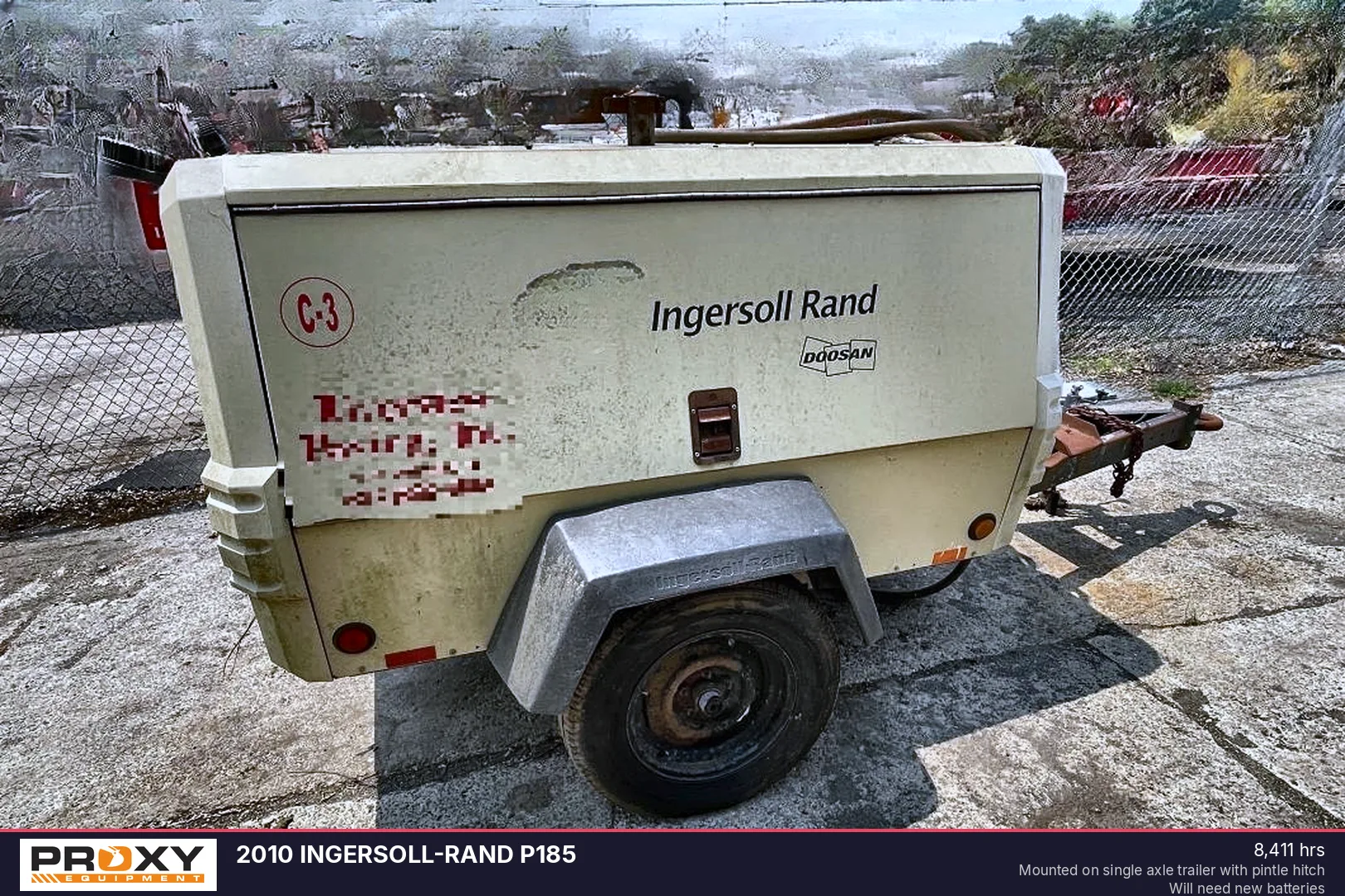 This 2010 Ingersoll-Rand P185 air compressor is powered by a 54-horsepower Deere 2.4L diesel engine and has recorded 8,411 hours of operation. The unit is mounted on a single-axle trailer equipped with a pintle hitch and ST205/75R/15 tires. Please note that the unit requires new batteries and may require additional maintenance to be fully operational.