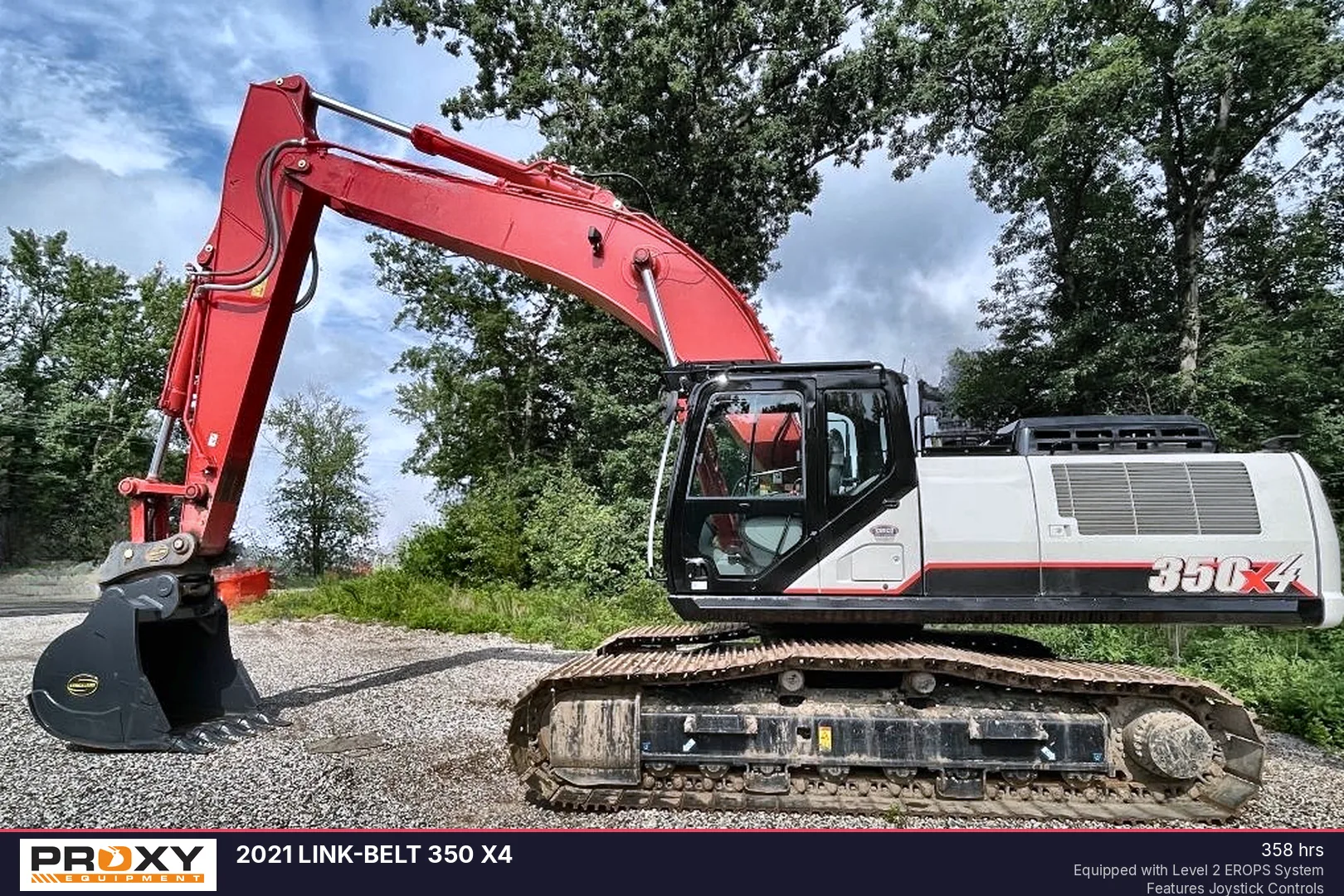 This 2021 Link-Belt 350 X4 is a low-hour excavator featuring only 358 operating hours on its 268-horsepower Isuzu AQ-6HK1X turbocharged diesel engine. The machine is well-equipped for demanding job sites with a Level 2 EROPS cab, a 280-degree camera system for enhanced visibility, and a Strickland hydraulic coupler and bucket setup. It is ready for immediate deployment with auxiliary hydraulics and a welded side bumper guard for added site protection.