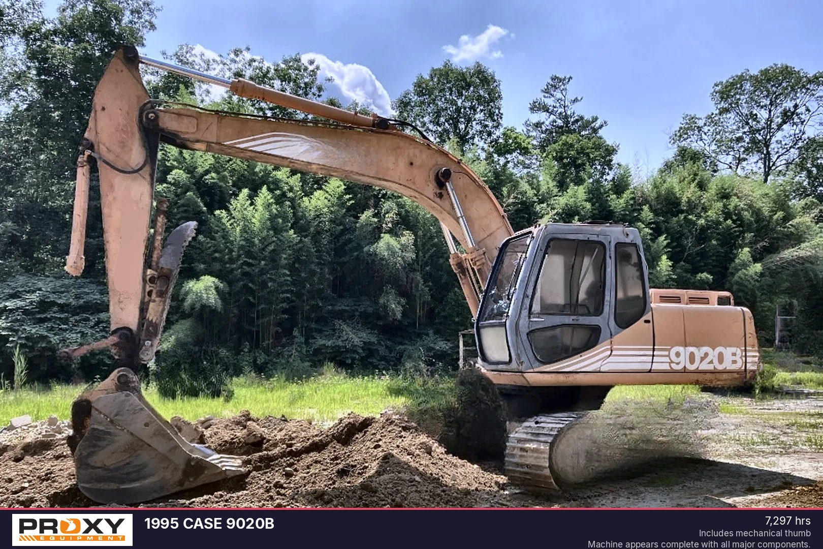 This 1995 Case 9020B excavator is powered by a 106HP Case 4TA390 diesel engine and features a reliable operational history with 6,500 recorded hours. The unit is equipped with a comfortable EROPS enclosed cab complete with both heat and air conditioning, as well as a mechanical thumb for enhanced material handling versatility. With an operating weight of 35,274 lbs, this machine is currently in good running and operating condition.