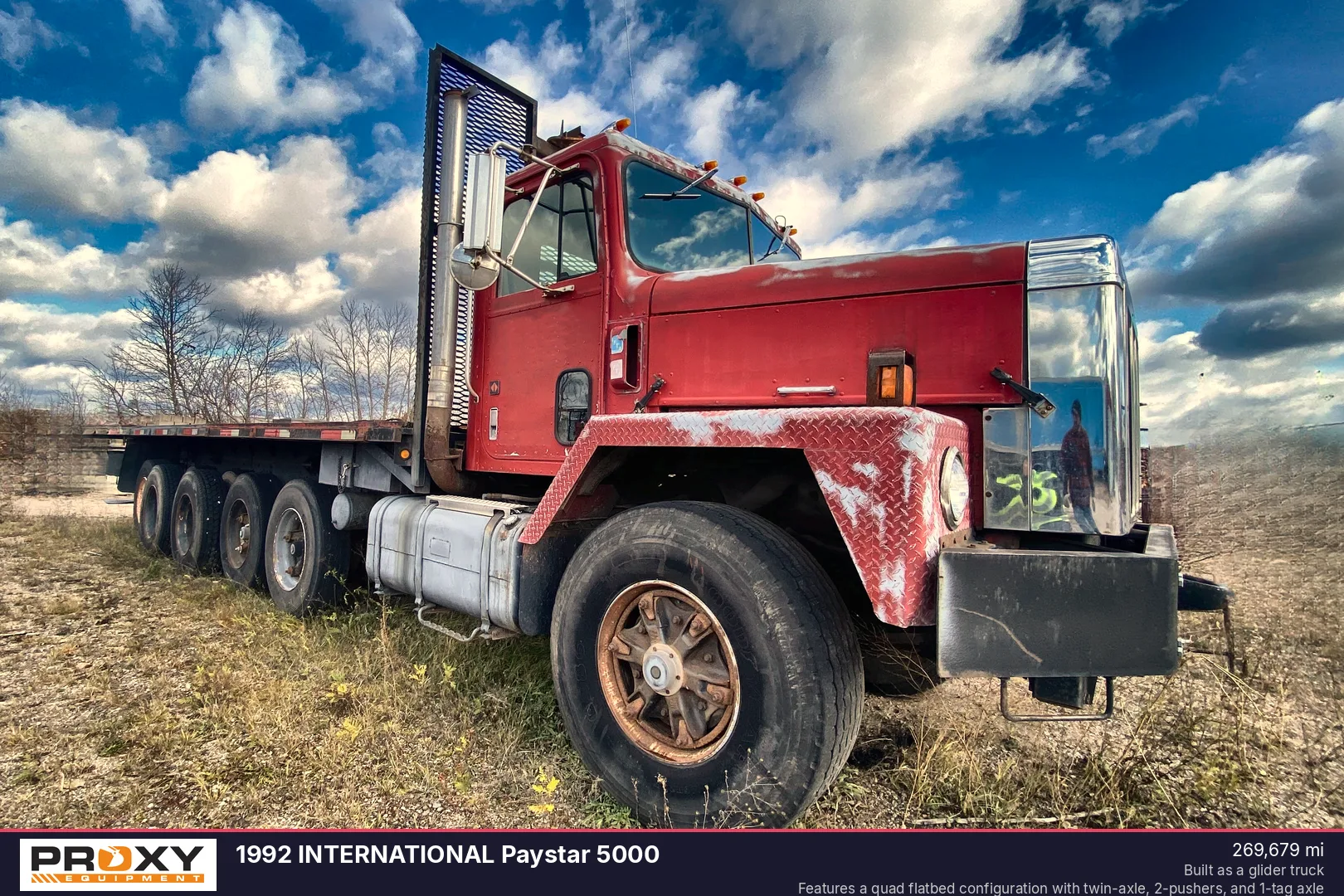 This 1992 International Paystar 5000 is a heavy-duty quad-axle flatbed truck equipped with a 400 HP Cummins diesel engine and a Fuller Roadranger 10-speed manual transmission. Featuring a 25' 6" bed and an integrated rear forklift mount, this well-maintained glider unit offers a 105,000 GVWR for demanding specialty applications.
