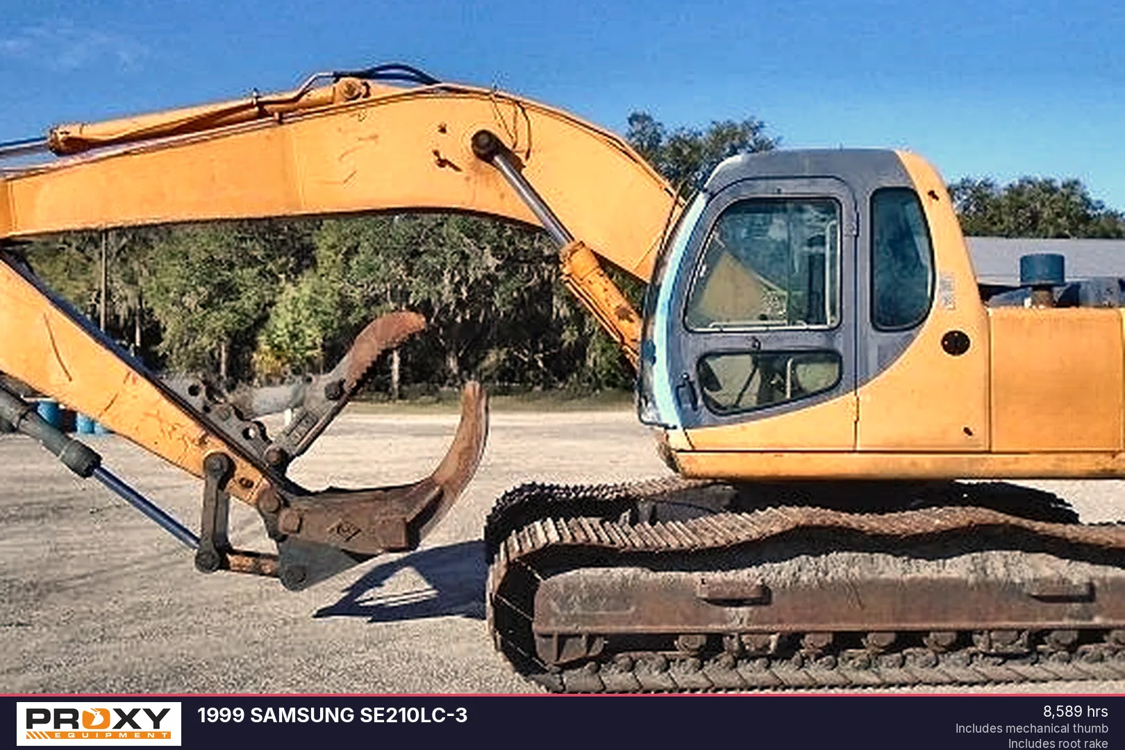 This 1999 Samsung SE210LC-3 excavator features a reliable Cummins B5.9C 143 HP diesel engine and comes well-equipped for land clearing and heavy site work with an included mechanical thumb, root rake, and 48-inch bucket. The unit has been well-maintained and recently updated with new pins, rollers, sprockets, and a turntable motor, with boom pins and bushings noted as being tight. Please note that while a new hydraulic pump was recently installed, there is a remaining issue with one of the valves.