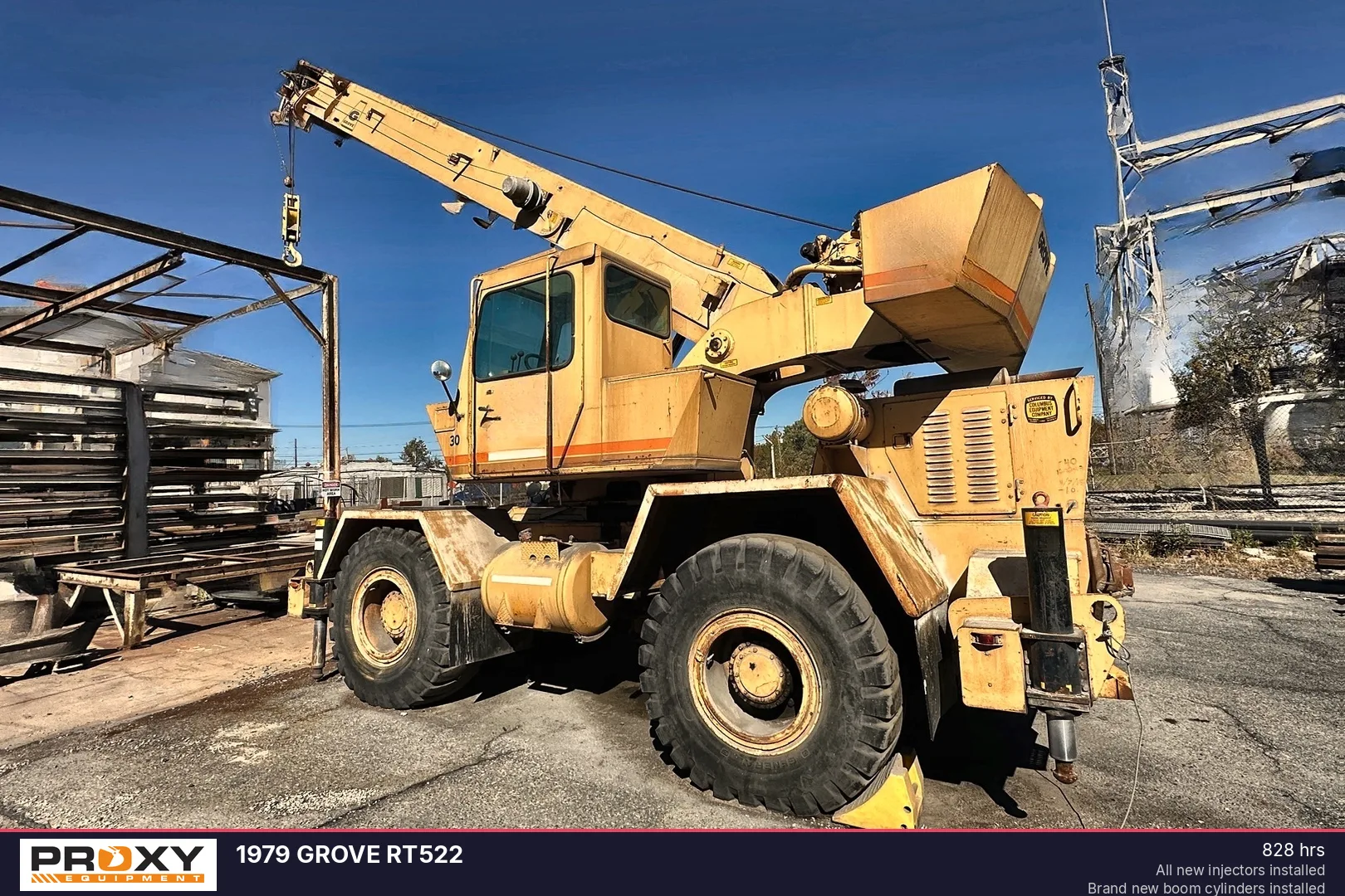 This 1979 Grove RT522 rough terrain crane is powered by a 115 HP Detroit engine and shows only 828 hours on the meter. The unit has undergone significant maintenance, featuring brand new boom cylinders, outriggers, and fuel injectors to ensure reliable operation for your lifting needs.
