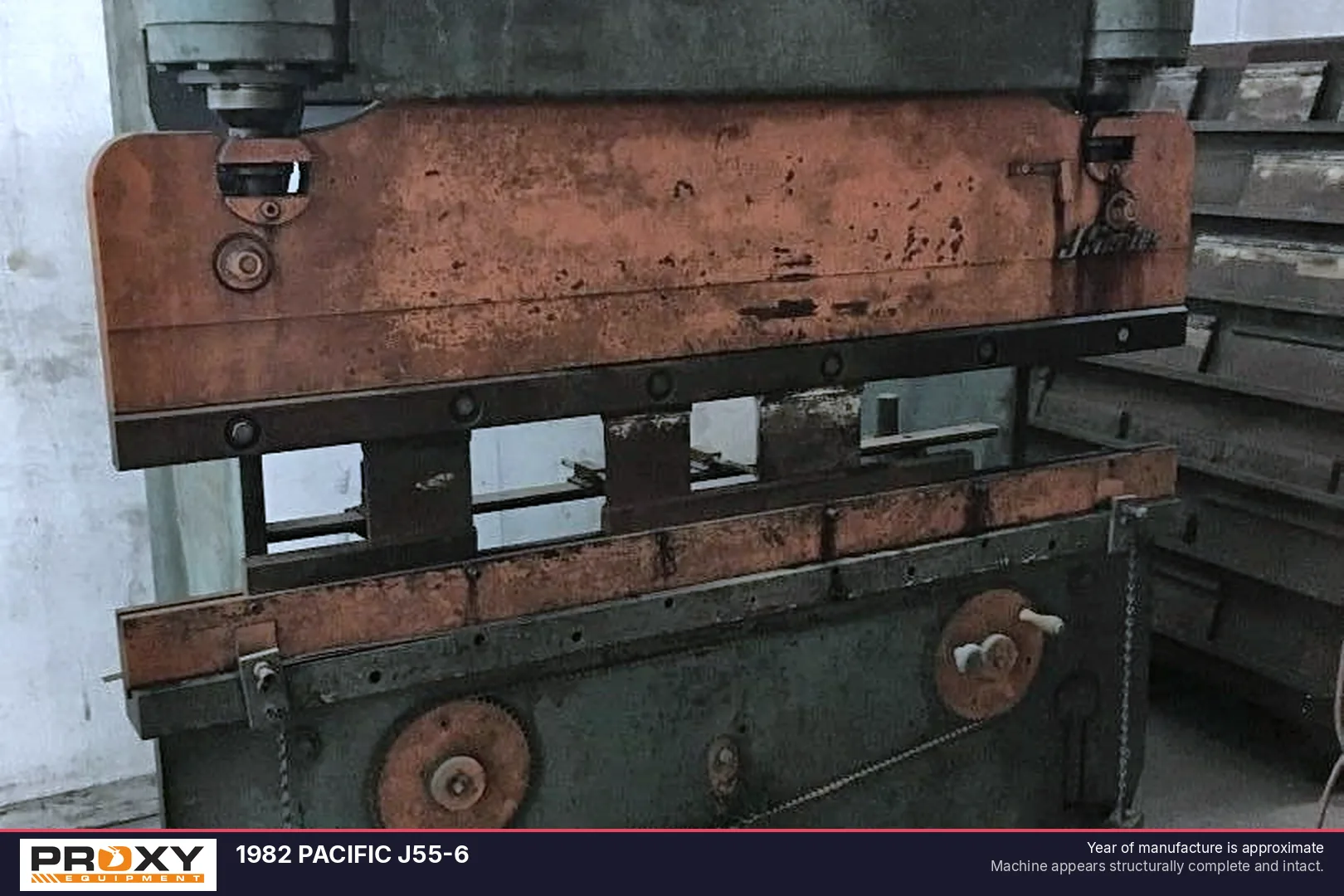 This Pacific J55-6 hydraulic press brake offers a 55-ton capacity suitable for precision metal forming tasks. It is configured for a material capacity of 3/16" thickness over a 4.5' bed length, providing a compact footprint for smaller fabrication projects.