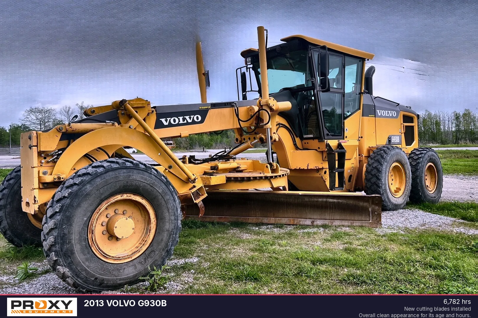 This 2013 Volvo G930B motor grader is powered by a Volvo D8HGBE4 119 HP engine and is currently showing 6,782 operating hours. The unit features an enclosed cab equipped with heat and A/C, and it has been outfitted with new cutting blades for immediate site deployment. It is fully operational, weighing in at 35,428 lbs with a 12.1-foot moldboard.