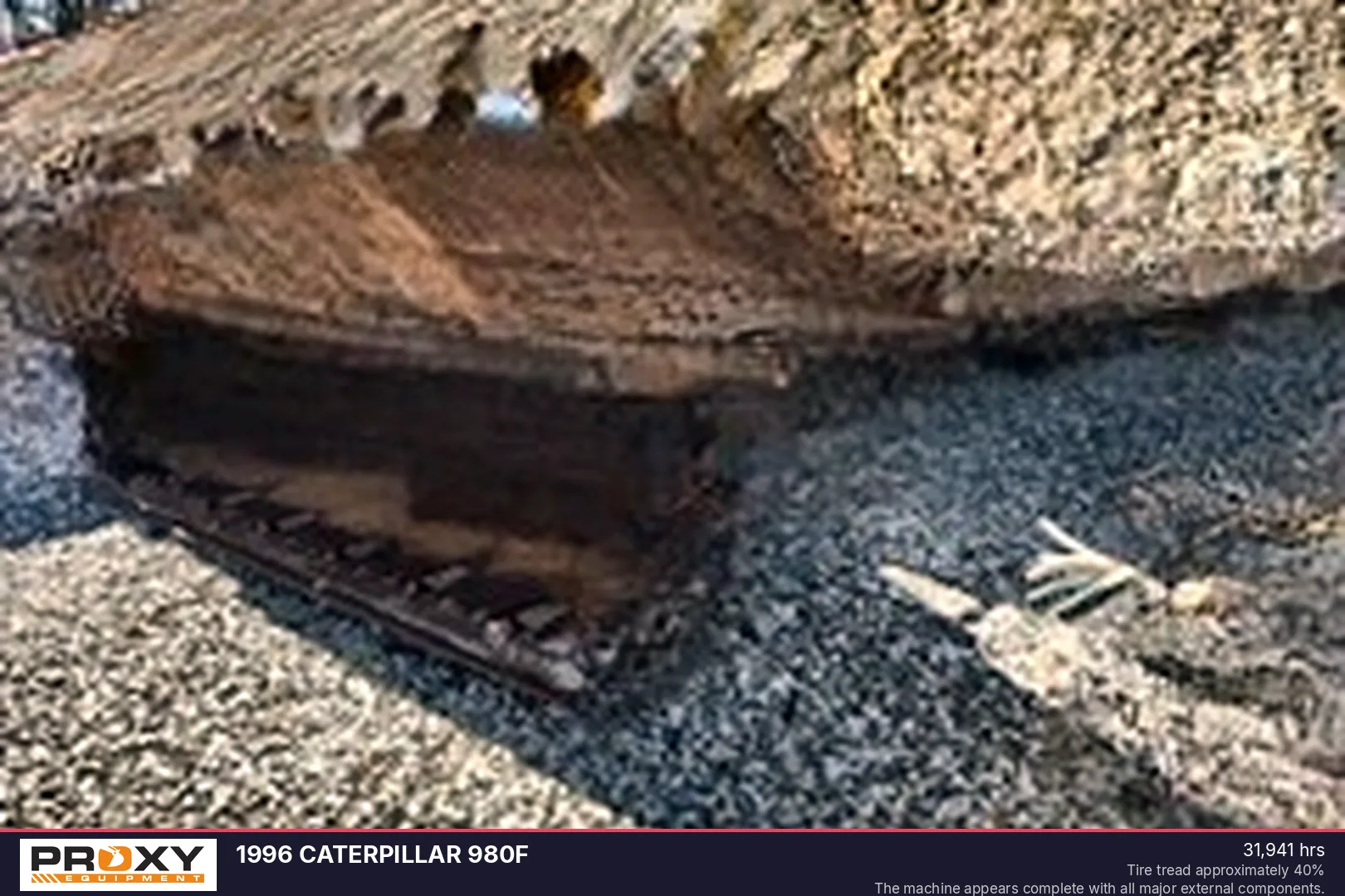 This 1996 Caterpillar 980F wheel loader is a heavy-duty production machine powered by a 675 HP 3408 engine. Equipped with a 9 yd3 bucket and weighing in at 100,705 lbs, it is well-suited for high-capacity material handling and loading operations. The unit features a 4-speed forward, 3-speed reverse transmission and currently sits on tires with approximately 40% tread remaining.