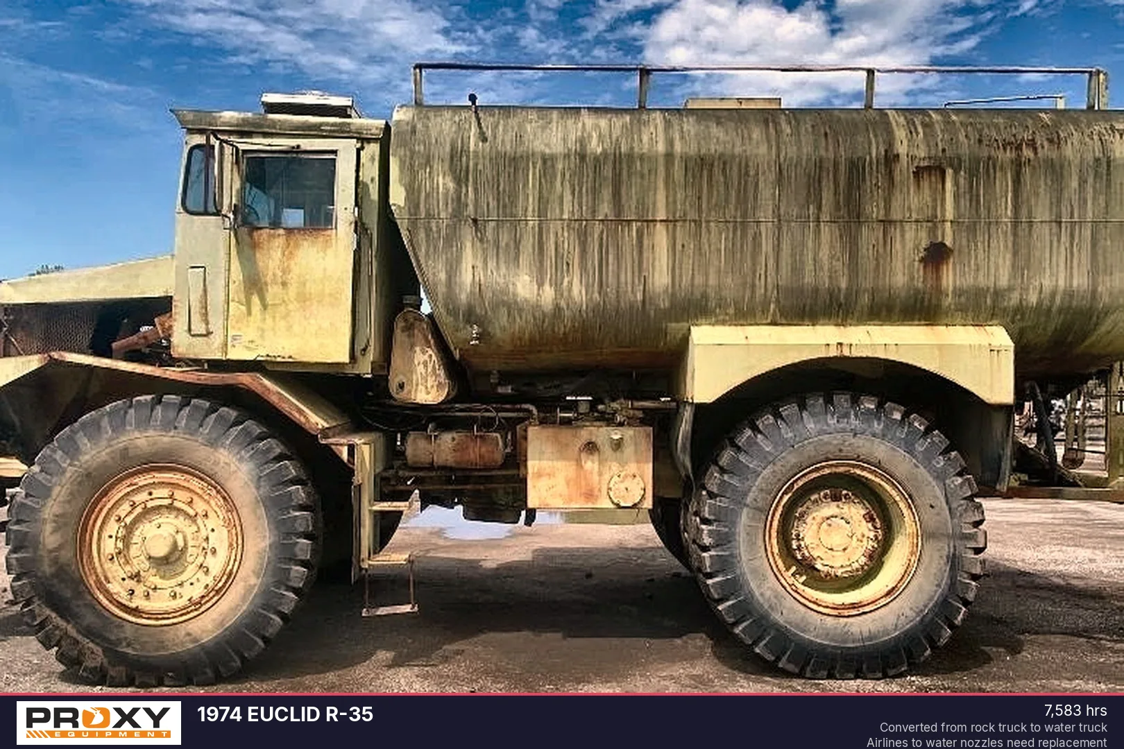 This 1974 Euclid R-35 has been converted from a rock truck configuration into a functional water truck. Powered by a 420 HP Detroit Diesel 12V-71N engine paired with an Allison CLBT-5861 six-speed full power shift transmission, this unit runs well and features reliable 18.00-33 tires. While the air compressor is operational, the airlines leading to the spray nozzles require replacement to restore full watering capabilities.