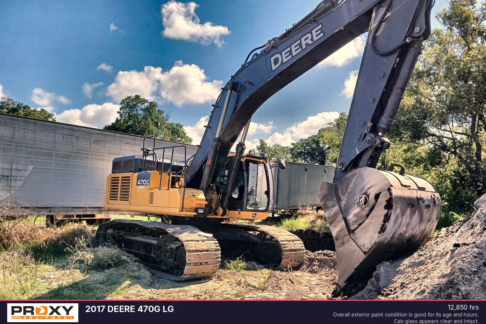 This 2017 Deere 470G LC crawler excavator is a high-capacity machine powered by a 367 HP Power Tech diesel engine. It features an enclosed cab with air conditioning and is equipped with a 4-yard bucket, making it well-suited for heavy-duty earthmoving and large-scale excavation projects. This unit is offered in good overall condition with an operating weight of 108,908 lbs.